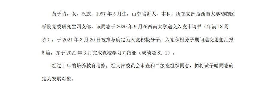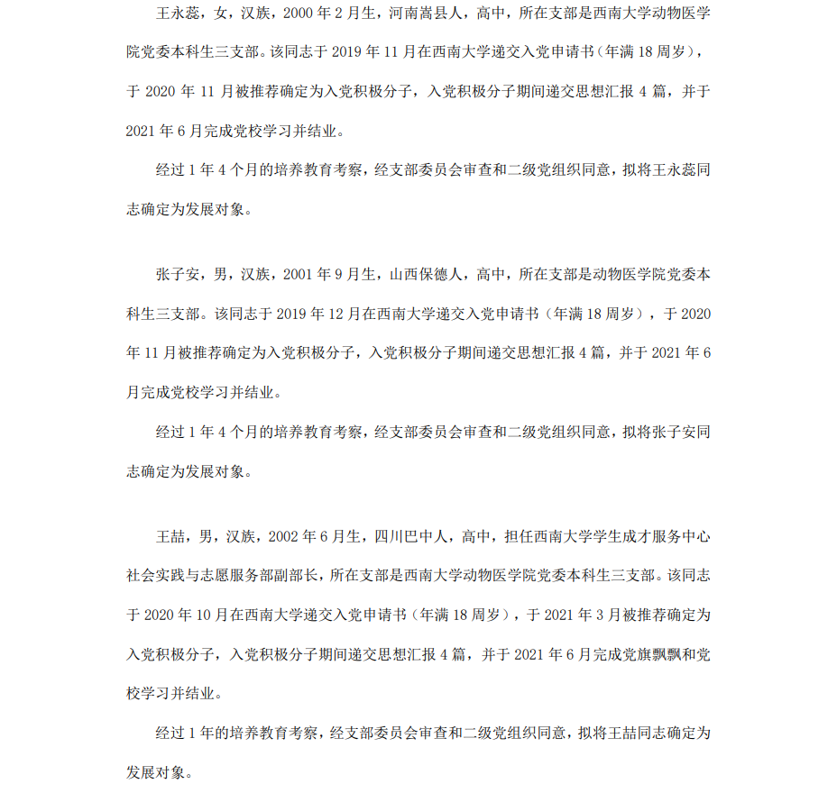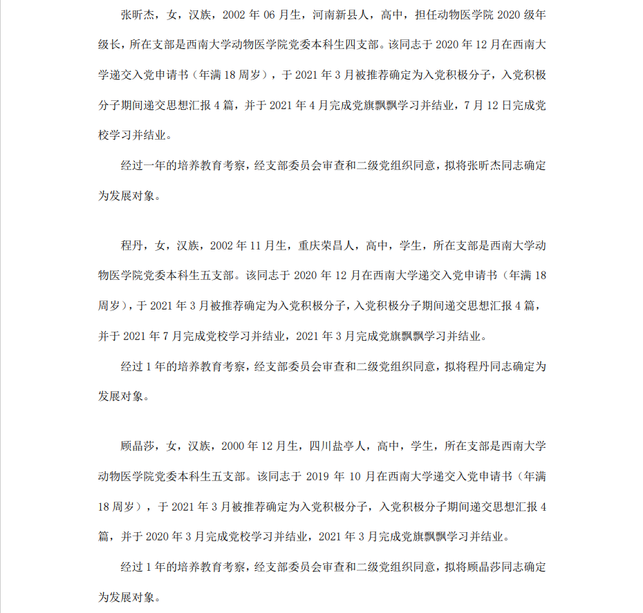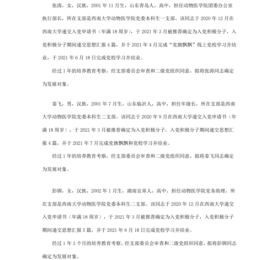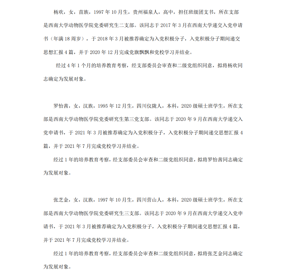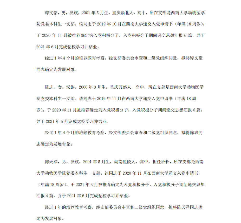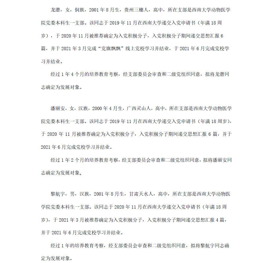 委员会讨论,拟定龙潜等49名同学为近期发展对象,现将其基本情况予以公示。