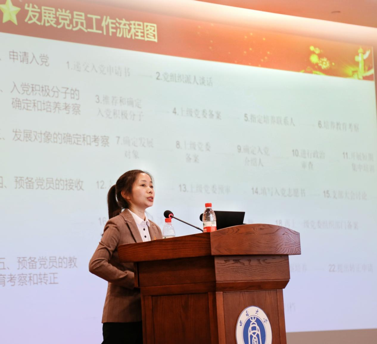 组织员杨银琼为新生详细讲解了入党流程和注意事项,包括入党申请、积极分子、发展对象、预备党员各个阶段的注意事项,向新生们讲解了入党申请书、思想汇报的格式要求、常见问题;并介绍了AV中文