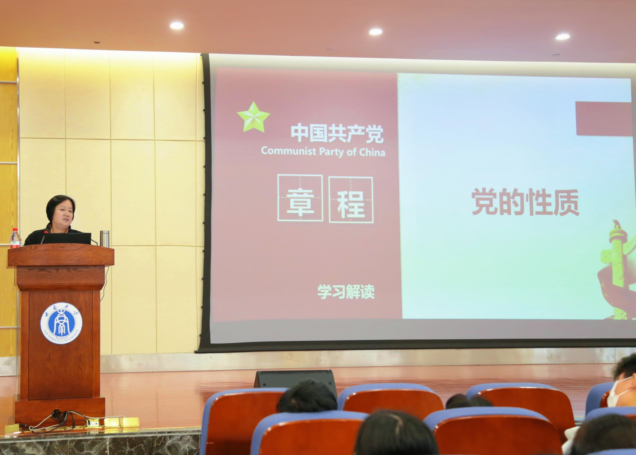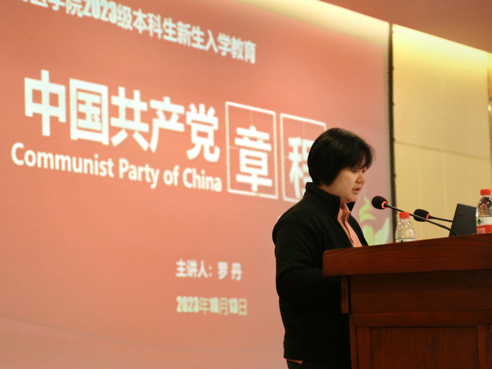 党委副书记、纪委书记罗丹带领新生学习了中国共产党章程;围绕“两个先锋队,一个核心,三个代表”深入浅出的解读了党的性质和党的宗旨,讲解了大学生如何做到全心全意为人民服务。她希望在场全体新生要不断增强政治思想素质,践行全心全意为人民服务的根本宗旨,全面提高自身综合素养和专业技能,做社会主义事业的合格建设者和接班人。
