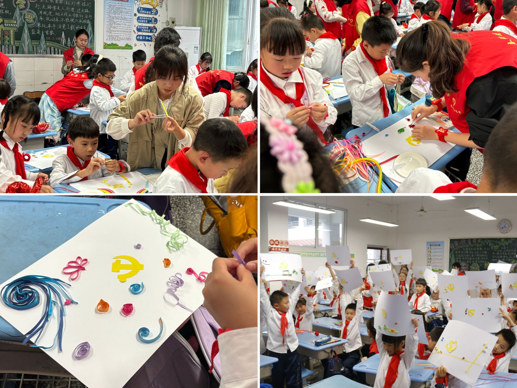 小朋友们拿起不同颜色的衍纸,在志愿者们的帮助下,发挥奇思妙想,以爱国主义为主题,围绕卡纸中央的党徽,制作衍纸画,在感受手工制作乐趣的同时,更加深刻地铭记革命先辈的丰功伟绩。