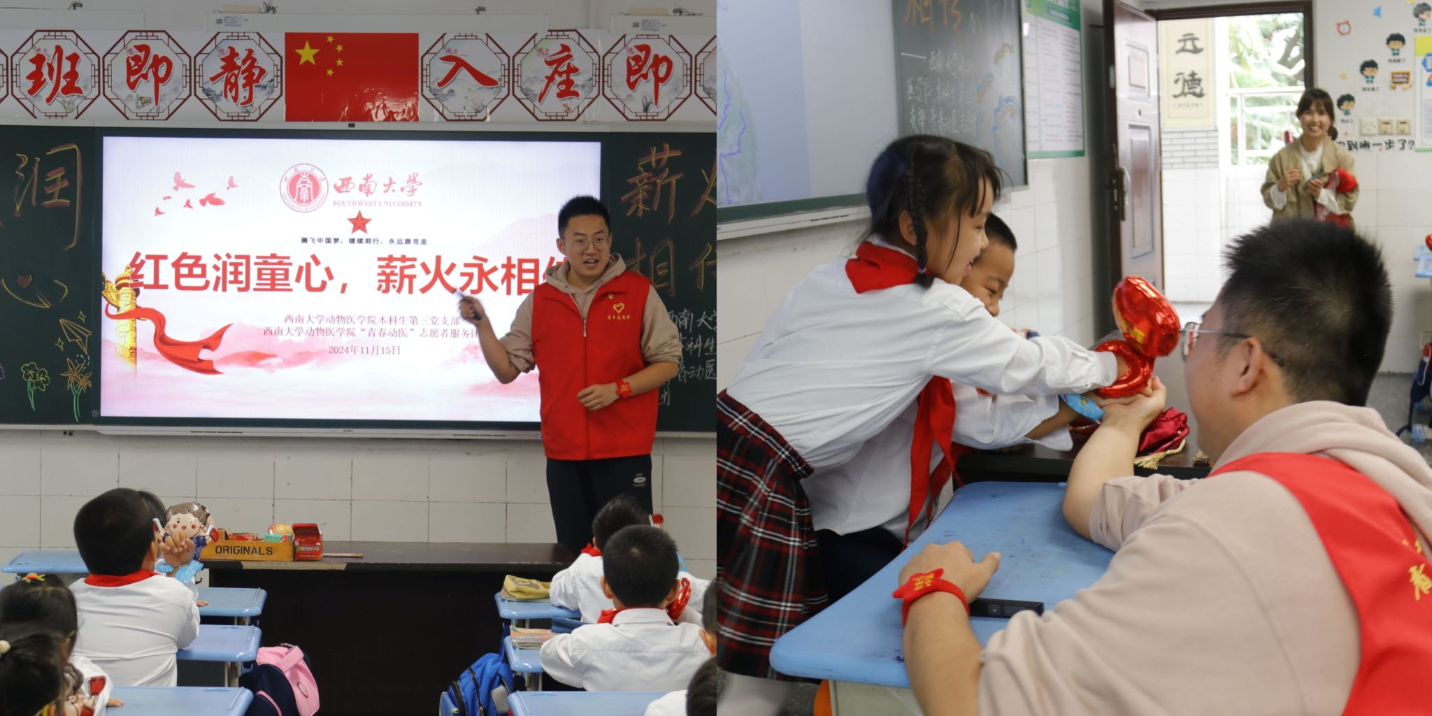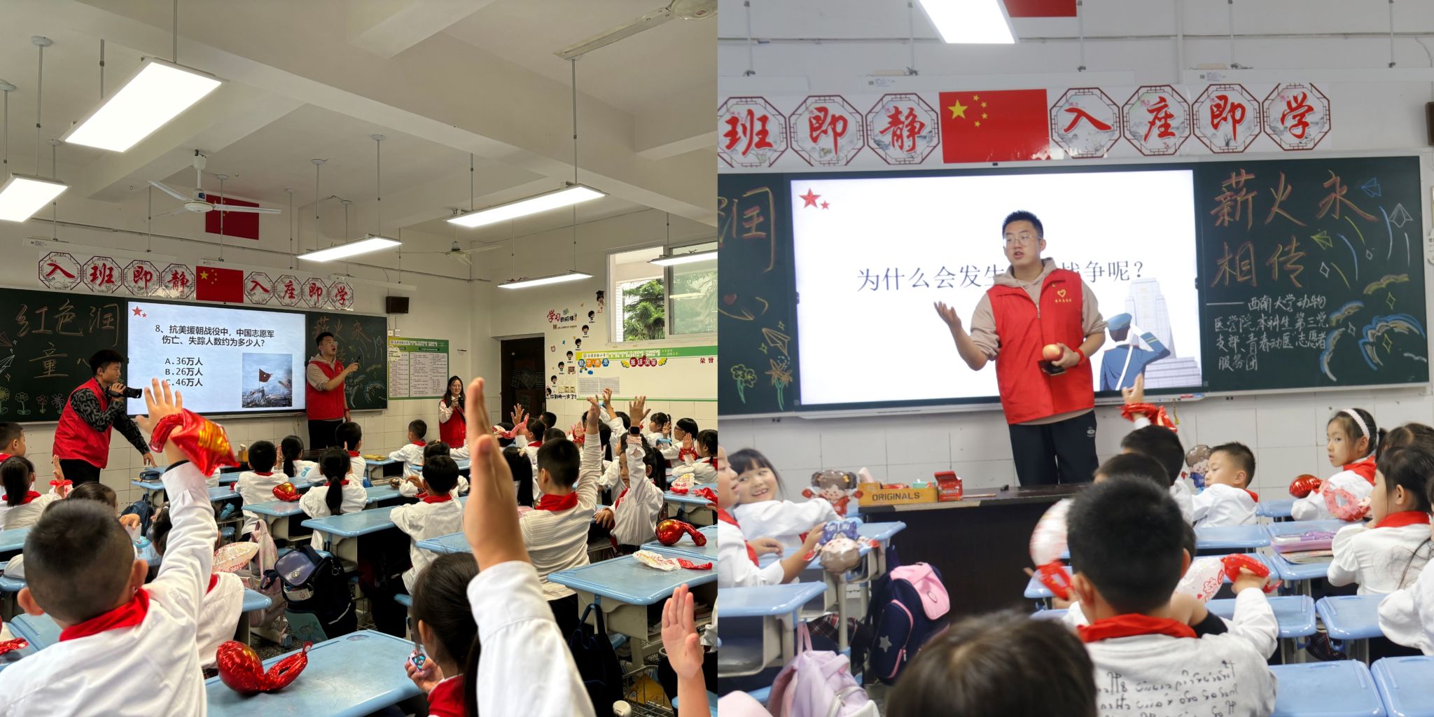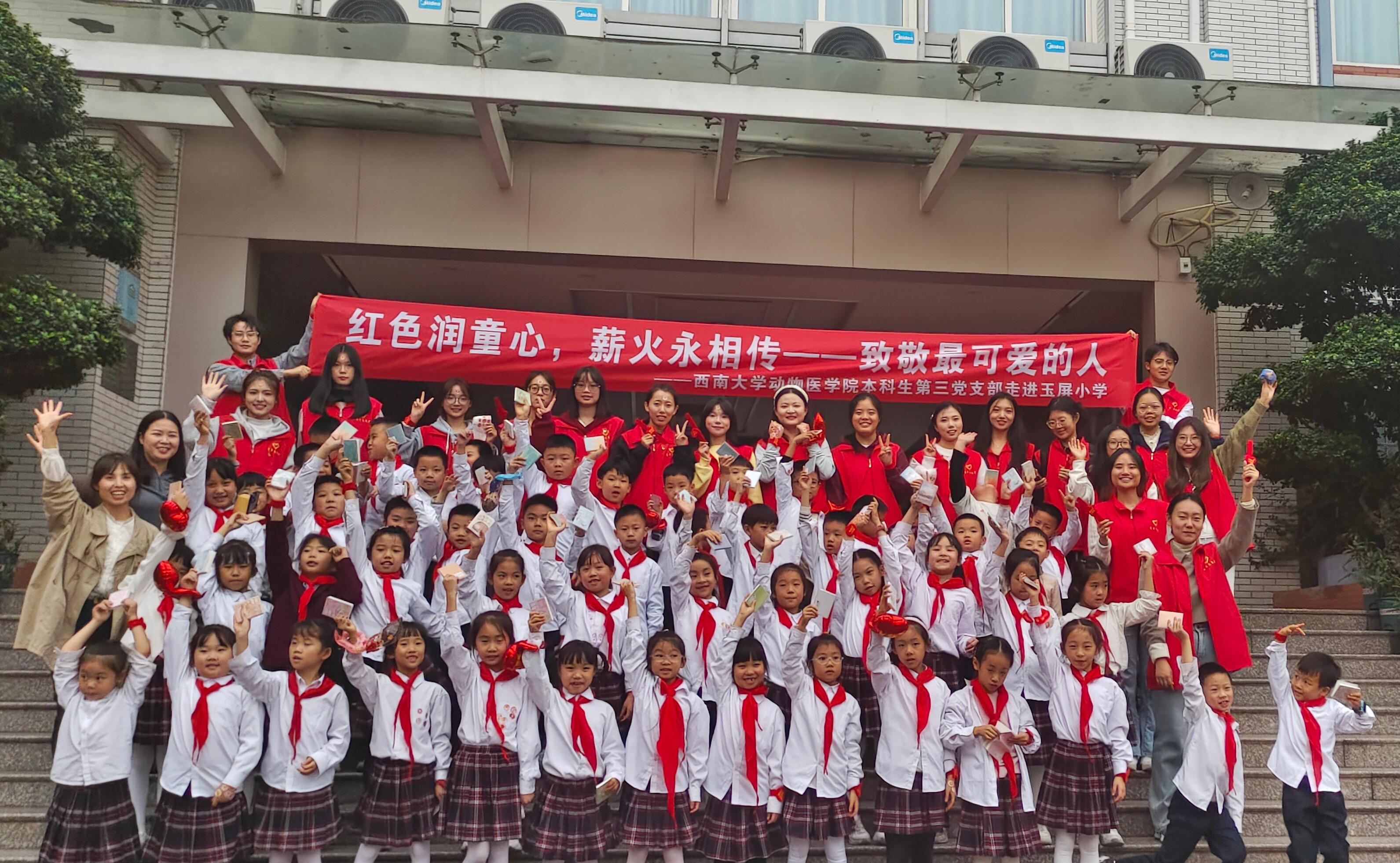 “青春动医”志愿者服务团和本科生第三党支部的志愿者们走进重庆市荣昌区玉屏小学,开展主题为“红色润童心,薪火永相传——致敬最可爱的人”的“大手牵小手”系列志愿服务活动,帮助小朋友们了解抗美援朝历史,激发爱国情怀!