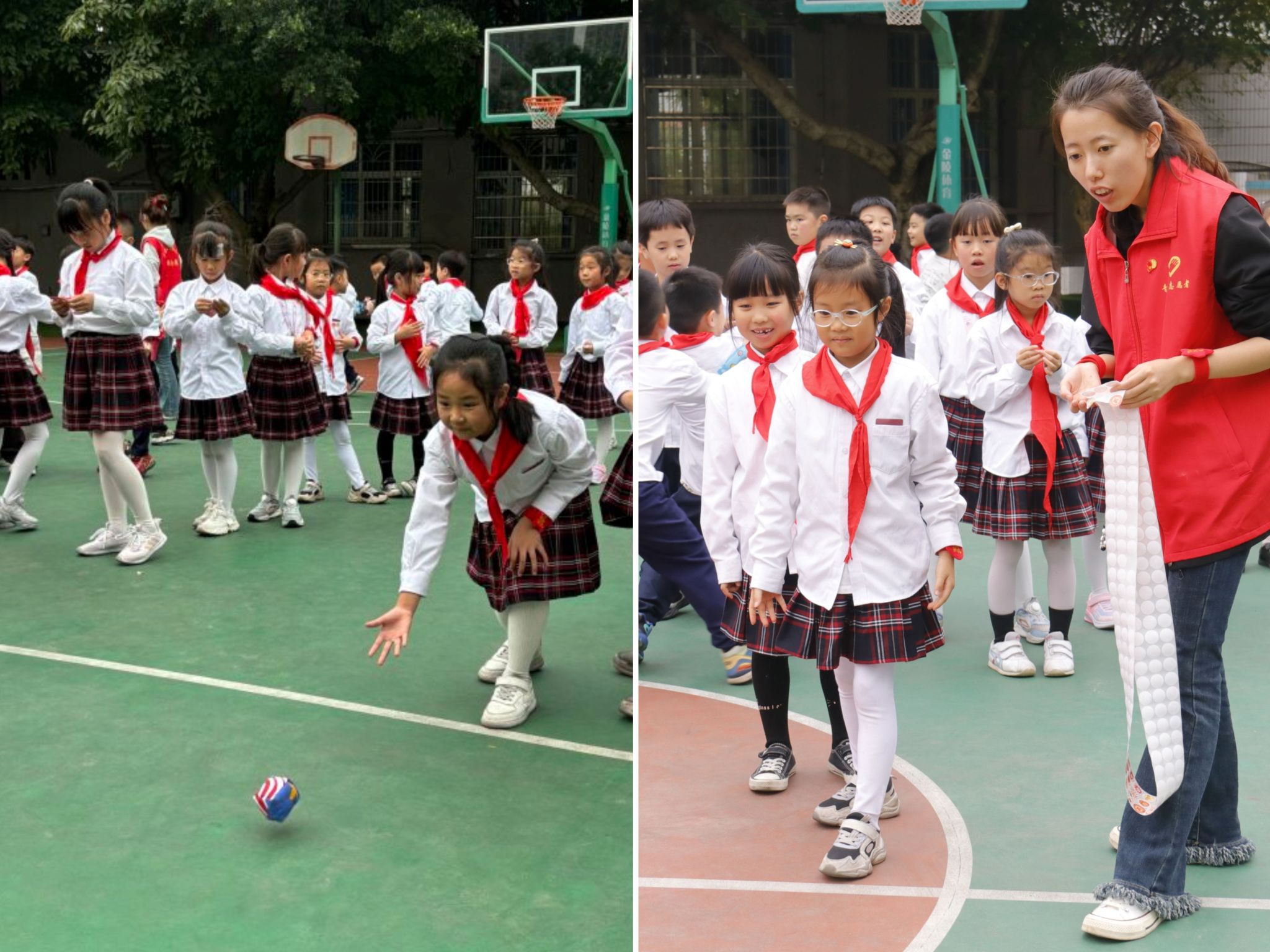“投掷手榴弹”趣味游戏环节将活动气氛推向了高潮!小朋友们分成五组,每人手持一个沙包,站在指定位置,将“手榴弹”投向地面上的圆形靶心,根据投掷准确度获得相应分数和奖励。欢声笑语中,小朋友们不仅体验了游戏的乐趣,也感受到了团队合作的重要性。