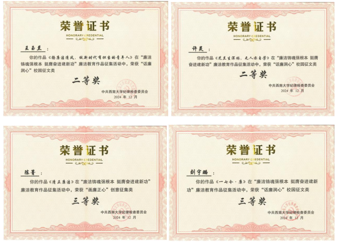 学校开展2024年“廉洁铸魂强根本 挺膺奋进建新功”廉洁教育系列活动中,AV中文 积极响应学校号召,广泛动员师生参与,并取得优异成绩。