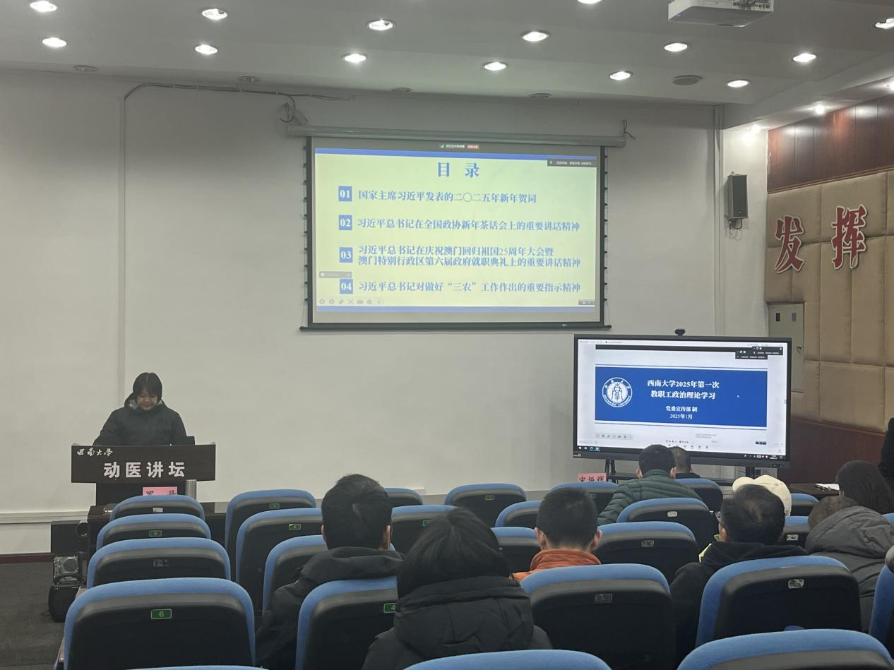 在荣昌、北碚同步召开2025年第一次教职工政治理论学习,集中学习了国家主席习近平发表的二〇二五年新年贺词、习近平总书记在全国政协新年茶话会上的重要讲话精神、习近平总书记在庆祝澳门回归祖国25周年大会暨澳门特别行政区第六届政府就职典礼上的重要讲话精神、习近平总书记对做好“三农”工作作出的重要指示精神。