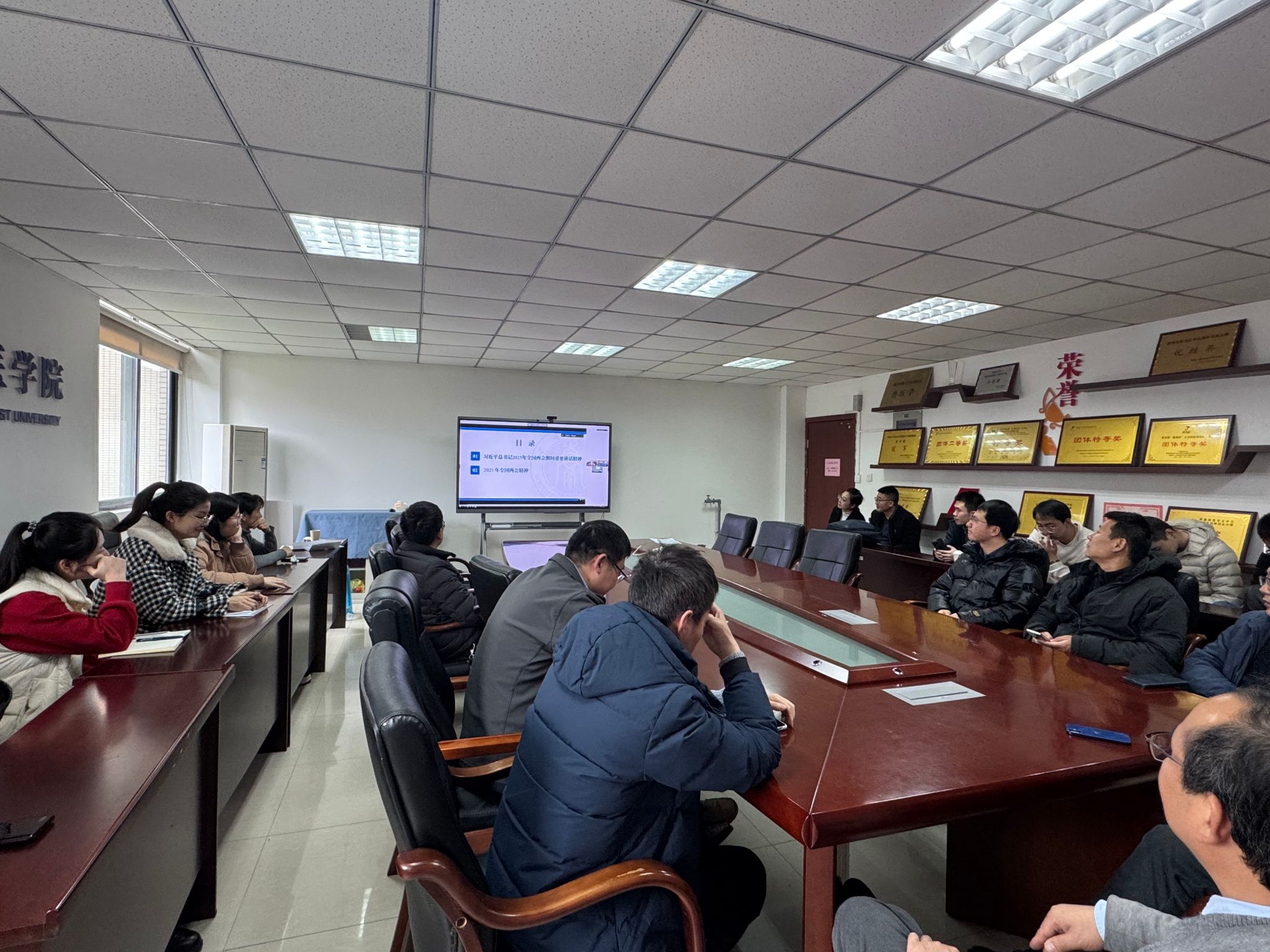 做好人才培养工作。随后,全体教职工集中学习2025年全国两会精神,全面了解全国两会基本情况、会议议程和工作报告,及时、准确地把握了国家的发展方向和政策导向,增强自身责任感,将职业发展同国家发展战略布局相结合,做好人才培养、科学研究和社会服务。