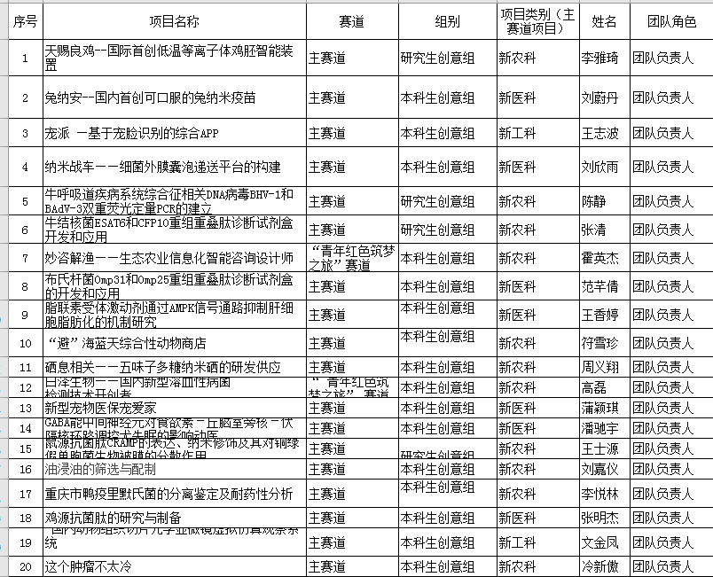 根据AV中文 《2022年“互联网+”大学生创新创业大赛选拔赛》的通知要求,学生自愿报名,专家已评审出前20名参赛团队。名单如下: