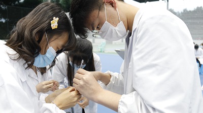 本次动医协会基础技能大赛决赛由个人赛和团体赛两部分组成,经过前期激烈的角逐,共有8位同学进入个人赛决赛,6支队伍进入团体赛决赛。其中,个人赛项目为绳结打结、器械打结以及对结的认识和器械认识;团体赛项目分为大肠缝合和犬的肌肉注射。比赛过程中,同学们各显所能,大放异彩,互相帮助,默契配合,尽展AV中文学子良好风貌。