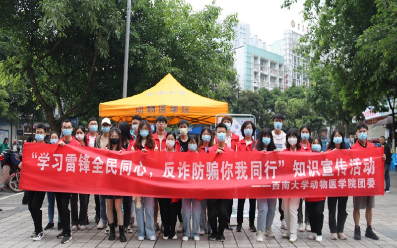 “青春动医”志愿者服务团在白象社区以及校园内共同开展反诈防骗宣传活动,提高人们反诈骗的意识,保护自身安全。