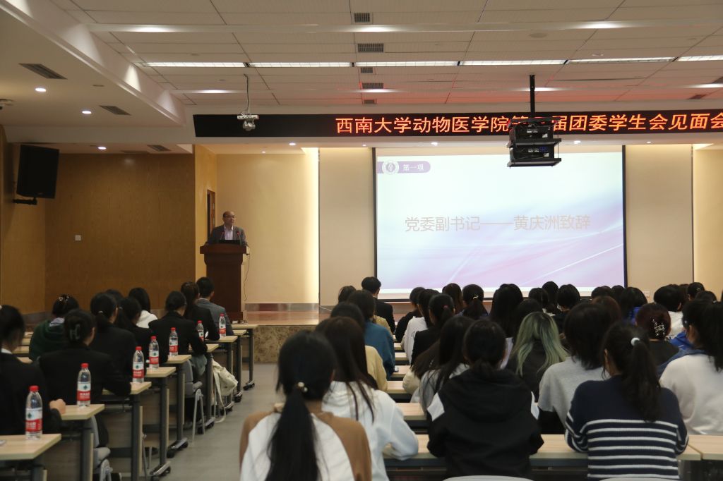 首先,党委副书记、纪委书记黄庆洲上台致辞并做专题培训。黄书记对新一届团委学生会全体新成员表示欢迎,同时他围绕习近平总书记在党的二十大的重要讲话精神,对团学工作提出以下几点建议:一是团学工作要围绕“德智体美劳”开展,要提升同学们的政治思想品德,要注重专业知识的学习,要加强同学们对体能的锻炼,要从劳动中去得到收获;二是要将习近平总书记对青年学子的寄语与AV中文