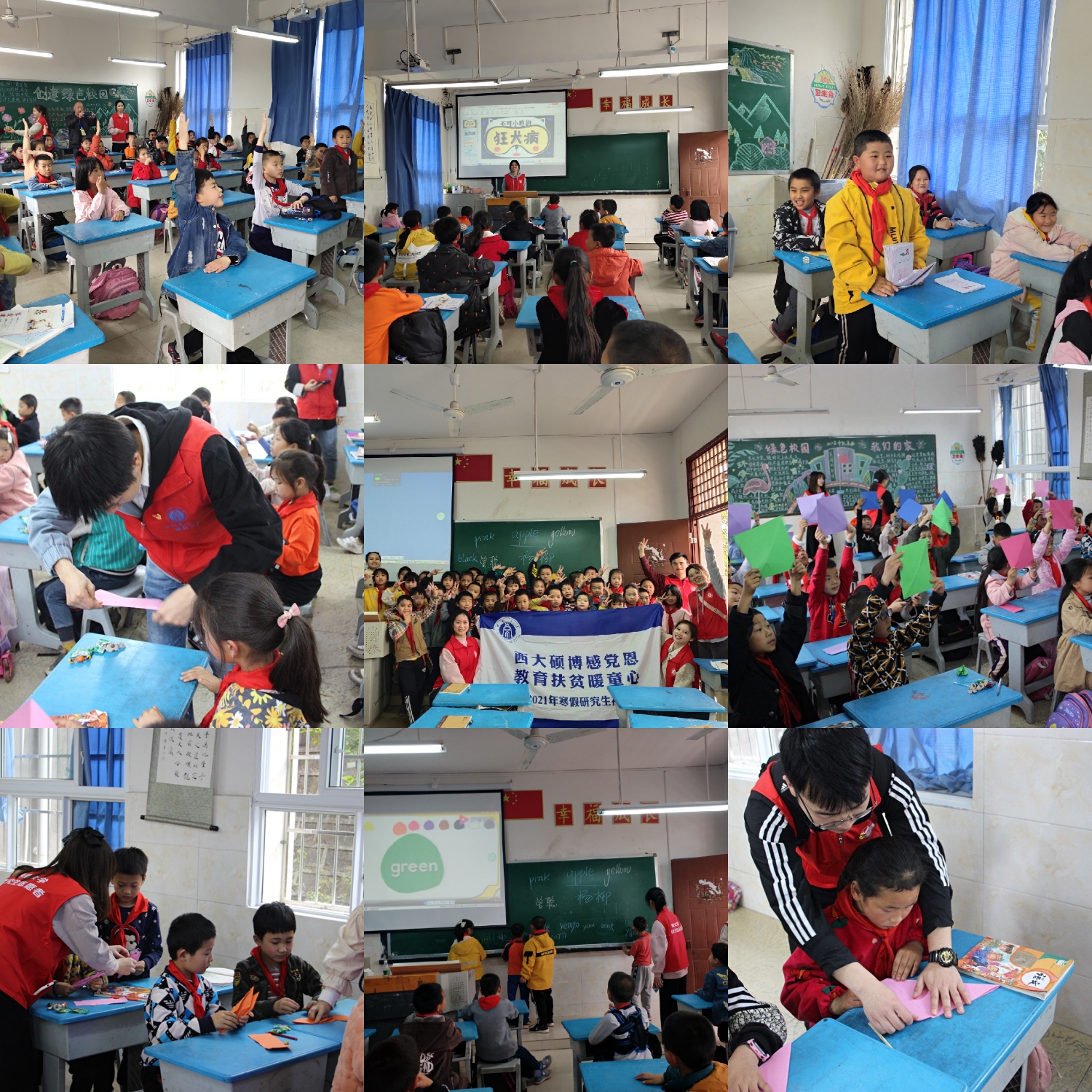 志愿者们来到铜鼓镇中心小学并了解了各年级的学习情况,分四个小组进行教学。首先是趣味英语学习,结合视频和志愿者的讲解与互动,让小朋友们喜欢上英语;志愿者通过手工教学折千纸鹤,让小朋友们写上自己对祖国、老师以及父母的祝福语,并送给他们,通过这个活动让小朋友们勤于动手并学会感恩;还有志愿者利用专业知识带小朋友们认识动物的另一面,教导小朋友们要爱护动物和它们和谐相处;另外,队员们给小朋友们讲解了狂犬病的知识,让小朋友们在喜欢动物的基础上,更要学会保护好自己。志愿者利用自己的专业知识带给小朋友们一种更奇妙的课堂体验。在课余时间,志愿者们和小朋友们在操场上打篮球等体育活动。在放学后,队员在班主任的带领下先后走访了十余户贫困学生家庭,询问孩子学习以及家庭情况、并给孩子们送去了学习、生活用品等。对于一些内向的孩子,志愿者们和他们聊天并开导。