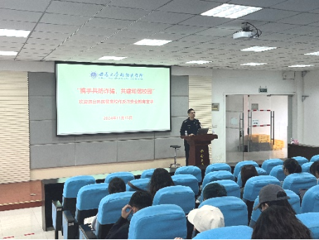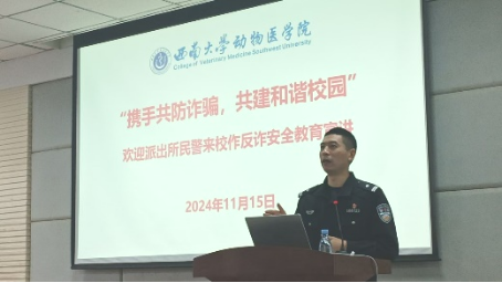本次活动特别邀请了北碚天生派出所的民警杜海洋到场,为本院师生详细讲解各种针对高校师生的诈骗手法和安全防范措施,进一步提高全院师生的安全意识和防范能力。辅导员李艳梅老师、陈向阳老师出席本次活动,北碚校区部分研究生、本科生参加。本次活动由陈向阳老师主持。