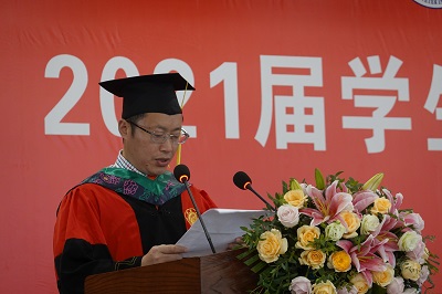 教授马跃、甘玲、李继祥、吴俊伟、周荣琼,辅导员刘晓兰、贺玲、吴秋云,毕业班班主任,毕业生家长代表及全体2021届在荣毕业生参加典礼。毕业典礼由党委副书记、纪委书记黄庆洲主持。