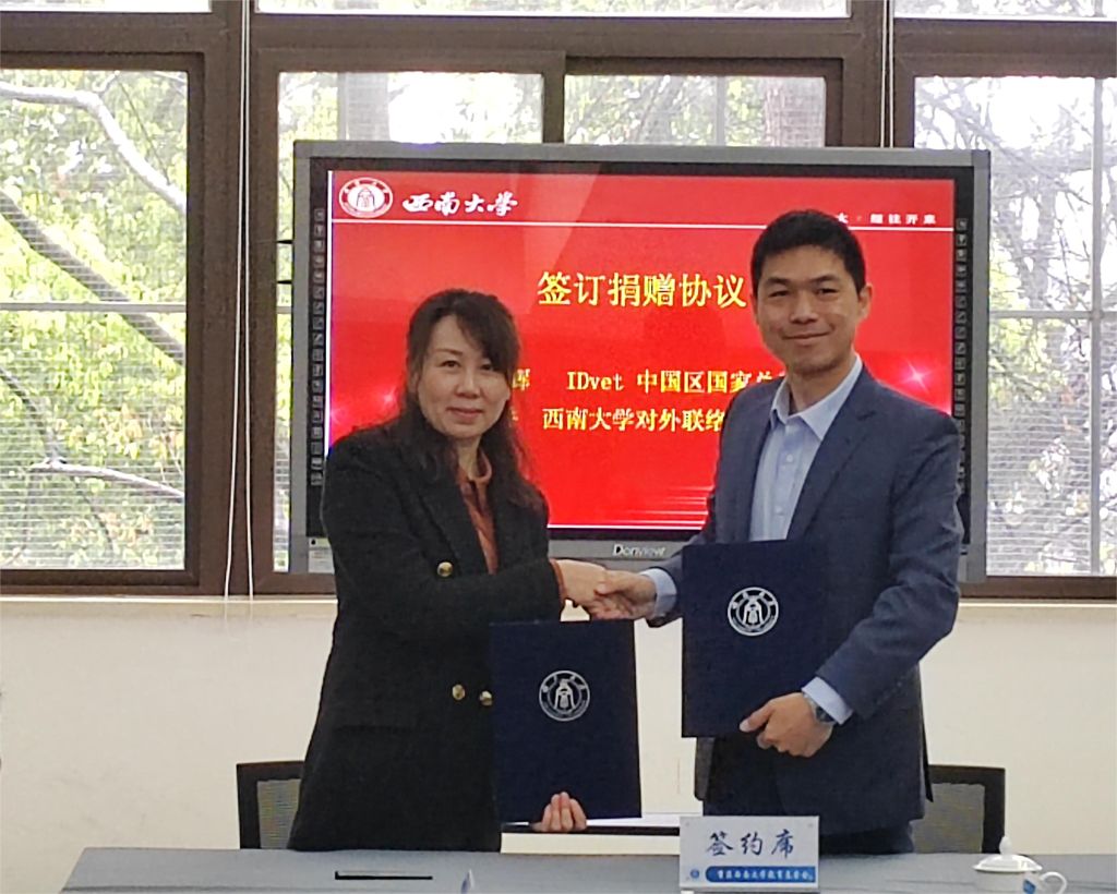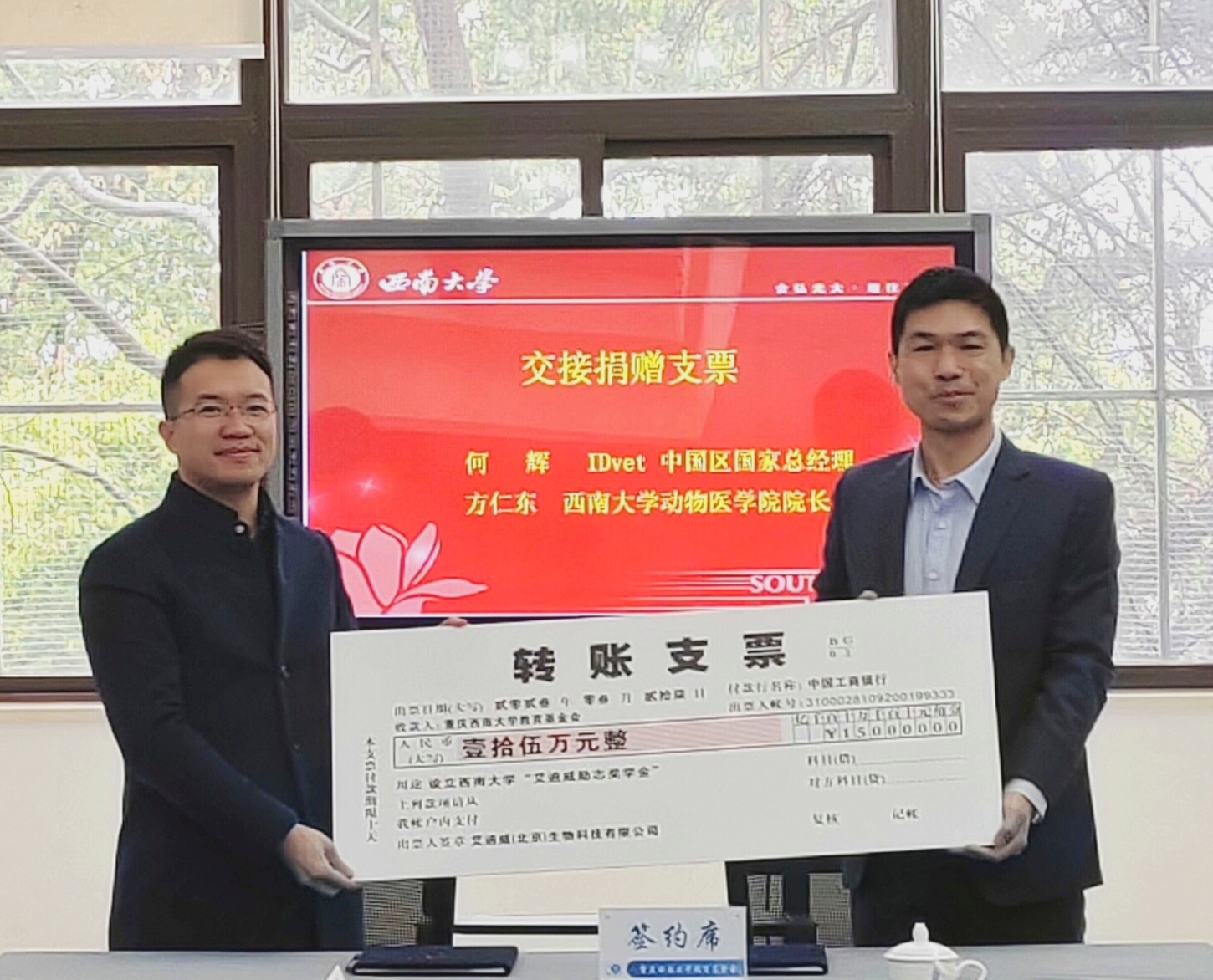 3月27日上午, IDvet中国区总经理何辉、IDvet中国区销售总监马超、IDvet中国区市场总监谢飞鸿、IDvet中国区大客户经理李文杰一行来访我校并向AV中文学子捐赠“艾迪威奖学金”。捐赠仪式在AV中文