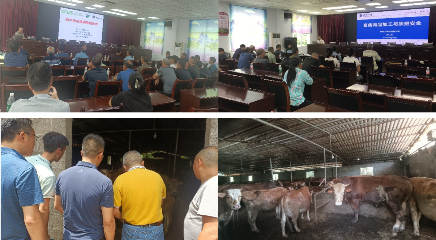 首先,志愿服务队一行在武隆畜牧发展中心技术人员彭刚的陪同下,来到武隆区和顺镇人民政府开展技术培训工作。彭远义教授、方仁东教授和叶超副教授分别作了题为“肉牛常见疫病防控技术”、“畜禽肉品加工与质量安全”和“生猪标准化养殖中的疫病防控和生物安全”的报告,分别向养殖户们详细讲解了牛结节性皮肤病和牛出血性败血症等肉牛常见疫病的防控方法与策略、畜禽肉产品加工的现状与面临的问题以及非洲猪瘟等生猪标准化养殖中的重要疫病的防控要点和策略等。来自和顺镇(10个行政村)的50多名当地养殖户接受了本次培训,专家通过现场培训和答疑对当地养殖户面临的技术难题给出了科学建议和解决方案。同时,服务队一行走访了当地的养殖户,深入了解了当地畜禽养殖情况,就疫病防控、饲料供给、集中育肥、补饲技术等作了深入交流指导,并给出了合理化建议。
