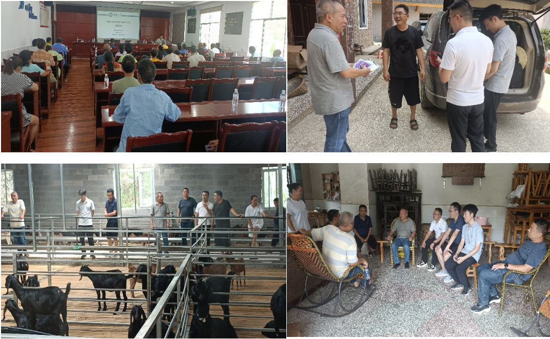 随后,服务队一行来到武隆区沧沟乡人民政府开展技术培训工作。彭远义教授、方仁东教授和叶超副教授给来自沧沟乡(5个行政村)的30多名当地养殖户分别进行了肉牛和生猪常见疫病防制、畜禽肉品加工及质量安全的相关技术培训,同时在现场为养殖户进行了答疑解惑。此外,在现场发放畜禽养殖疫病防制技术手册30余本,补液药和驱虫药等兽药共2箱,并为养殖户们详细讲解了药品使用方法和适用范围。而后,服务队又先后走访了饲养当地优良地方品种“板角山羊”的养殖户及“板角山羊”的保种场,与养殖户就山羊养殖数量、饲养方式、养殖效益及疫病防控等进行了交流。