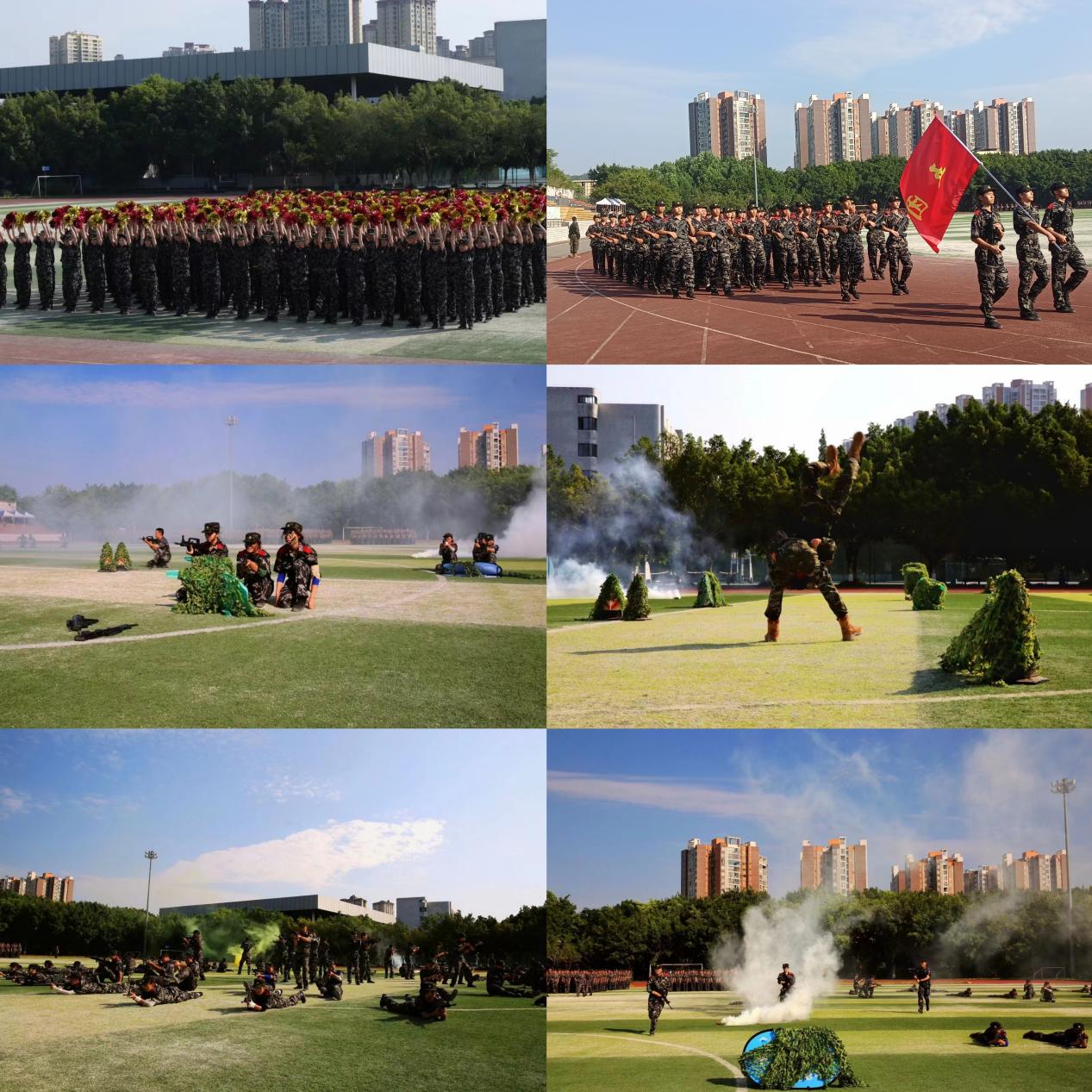 9月7日上午,于荣昌校区运动场汇报展演。动医学子迈着整齐的步伐,依次走过主席台接受检阅。接着,心理健康操、擒敌拳、拳术、匕首操、单兵及班排进攻战术、队列操和警棍盾牌术等科目表演轮番精彩上阵。正步如仿宋规整正式,齐步如楷书工整划一,跑步如草书行云流水。有舞刀者,横竖之间划破浩荡长空;有弄棍者,撇捺之中棒打满天星月。伴随着音乐的鼓点,肆意挥洒青春的活力。现场高潮迭起,掌声雷动。