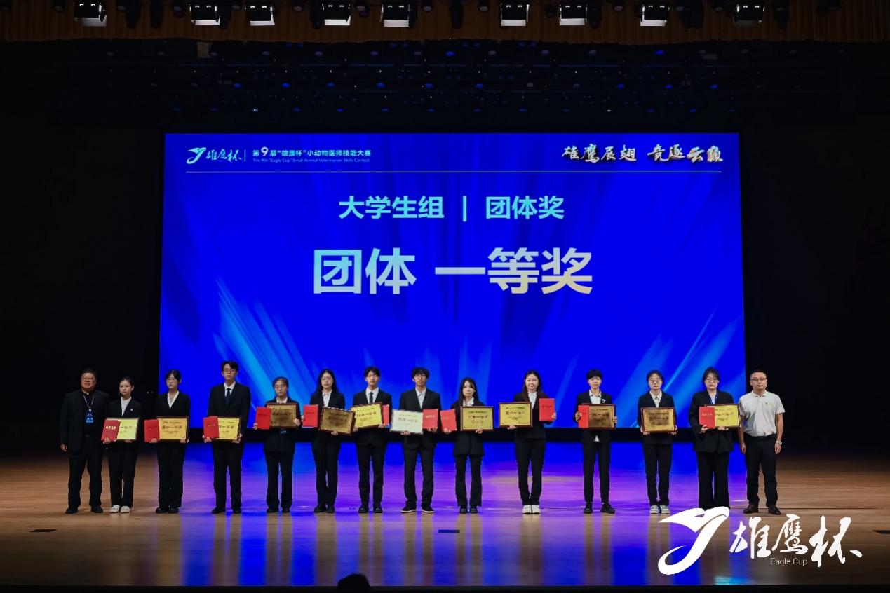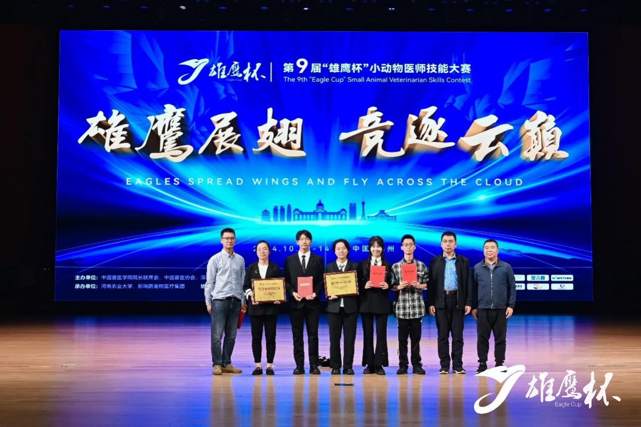 也始终铭记荣誉,秉承以学生为中心的理念,由专业的教师团队提供全程的指导和支持。同时,各级领导对比赛给予了极大的关注,全力确保备赛工作的顺利进行,为参赛团队提供指导和鼓励。最终,AV中文学子荣获第九届“雄鹰杯”小动物医师技能大赛大学生组“团体一等奖”,AV中文