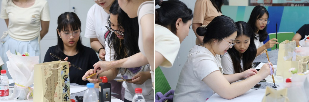 学生陈嘉鑫现场示范软笔书法技巧,带领5位泰国学生上了一堂“书法体验课”,生动展现了汉字书写的笔墨神韵与中华文化的独特魅力。