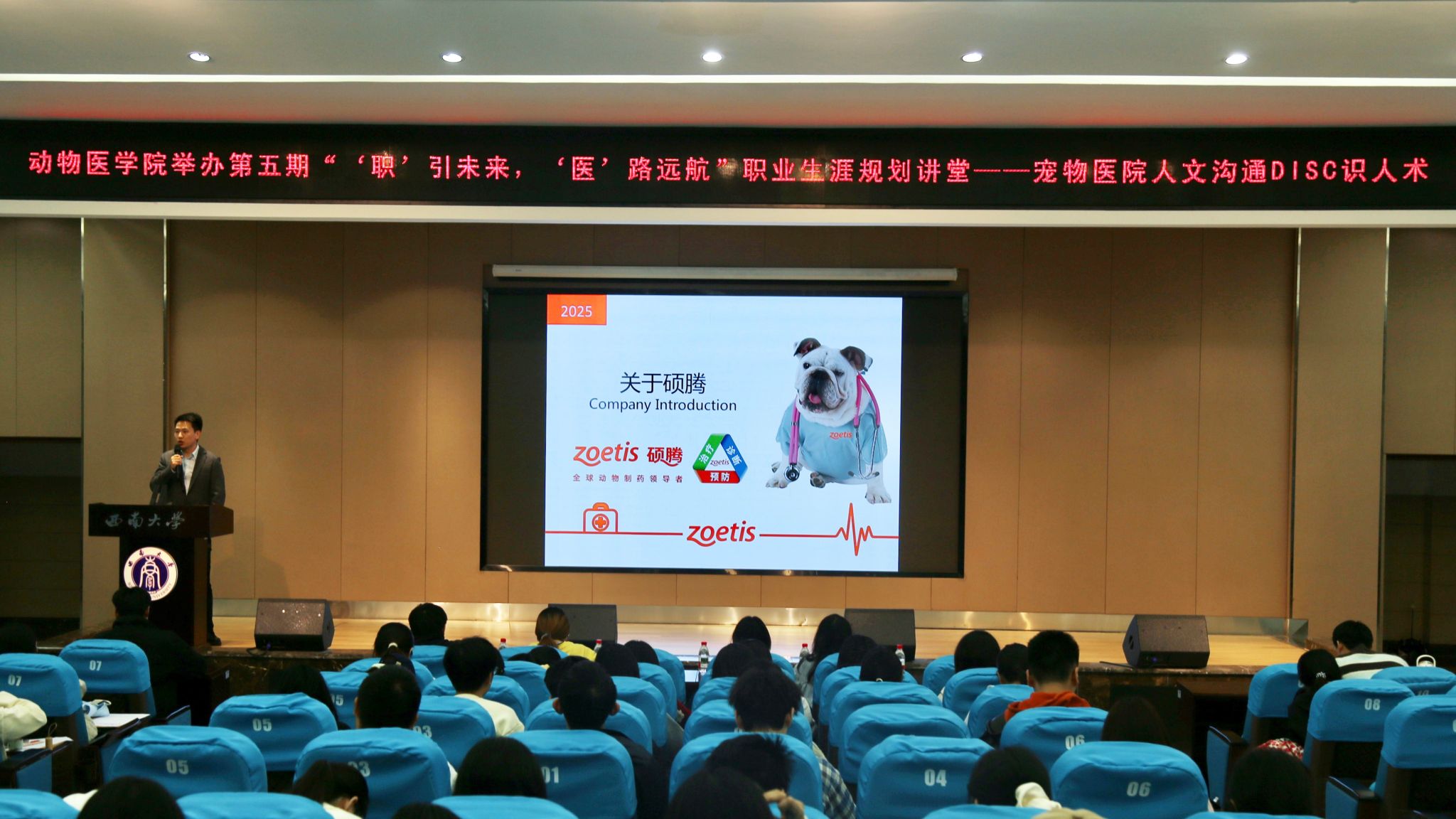 在荣昌校区2211报告厅成功举办第五期“‘职’引未来,‘医’路远航”职业生涯规划讲堂。本期活动特邀硕腾(上海)企业管理有限公司西南二区经理杜港,带来题为“宠物医院人文沟通与DiSC识人术”的专题分享,吸引AV中文