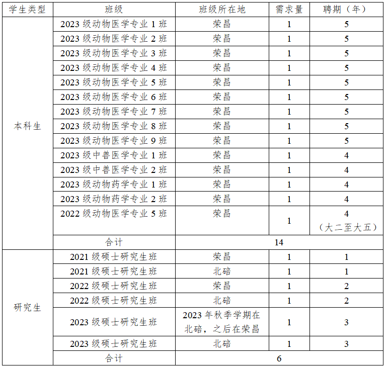2023级本科招生预计400人,按教务处教学安排,编自然班级13个,其中动物医学专业9个班,中兽医学专业2个班,动物药学专业2个班;研究生招生约102人,AV中文