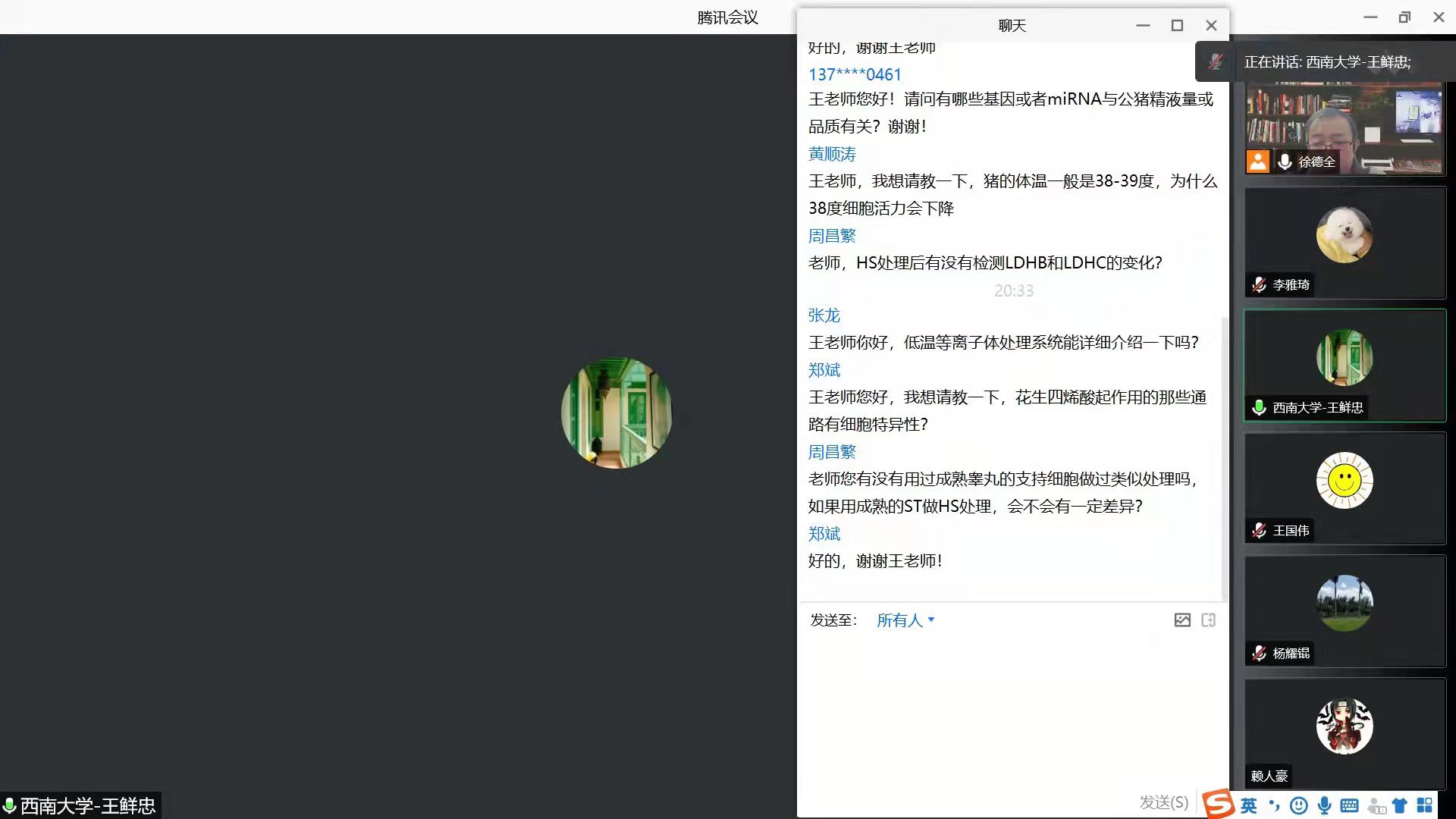 王鲜忠教授以“公猪睾丸支持细胞对热应激的响应及精液品质改善”为题,从热应激对细胞周期、细胞代谢、细胞连接等方面的影响入手,多角度分析了热应激给公猪生精功能带来的负面影响,并结合课题组已有研究提出了运用并优化低温等离子体处理技术改善精液品质的策略。该策略的提出展现了不同学科融合创新,为今后多学科专业交流融合提供了参考。