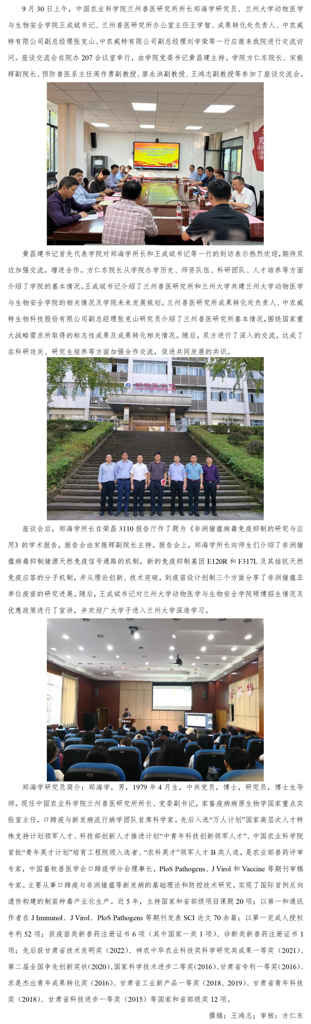 中国农业科AV中文 兰州兽医研究所郑海学所长一行来AV中文交流并作学术报告
