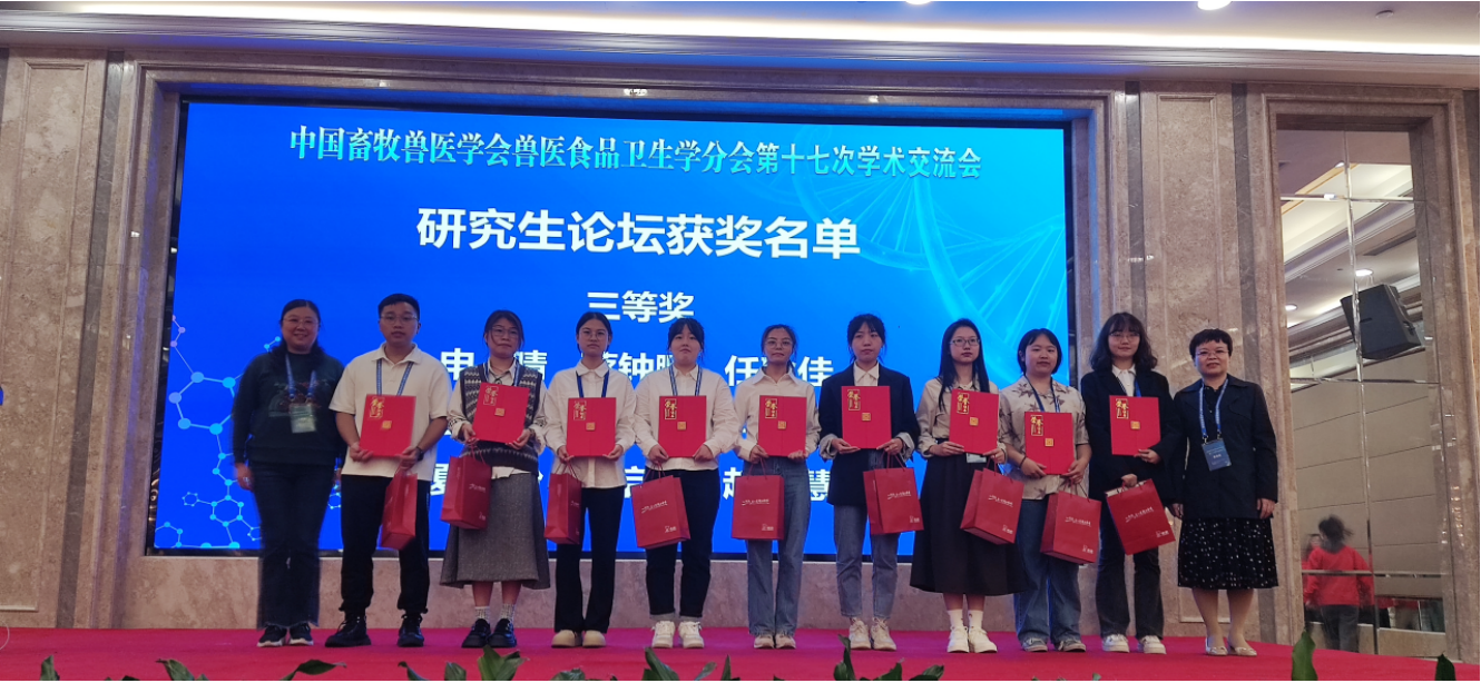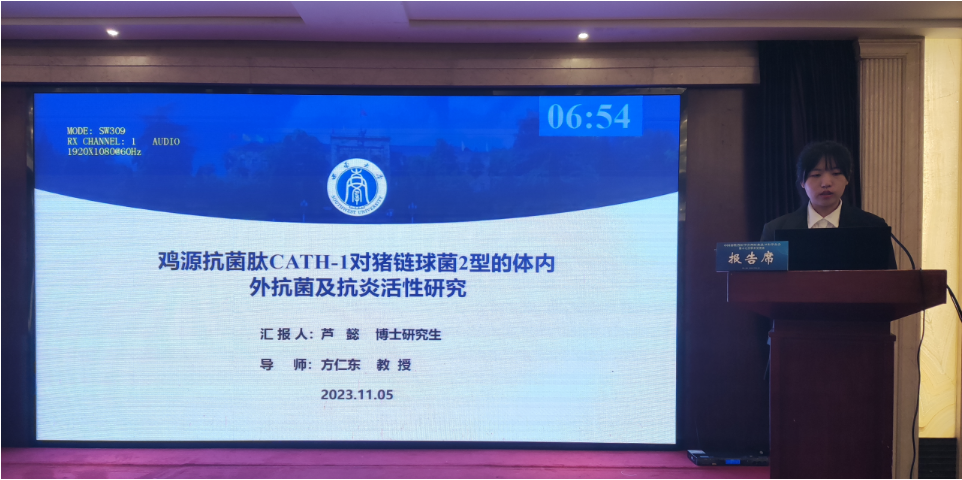博士研究生芦懿以“鸡源抗菌肽CATH-1对猪链球菌2型的体内外抗菌及抗炎活性研究”为题进行了学术汇报,并荣获“研究生论坛三等奖”;硕士研究生于惊蛰以“生鲜猪肉中有机磷酸三酯的污染水平及膳食暴露风险评估”为题进行了汇报。两位研究生的学术报告充分展示我了AV中文学子的优秀风采,通过与参会专家及同行的积极交流也拓展了学生的学术视野,获益良多。会议期间召开了常务理事会,AV中文