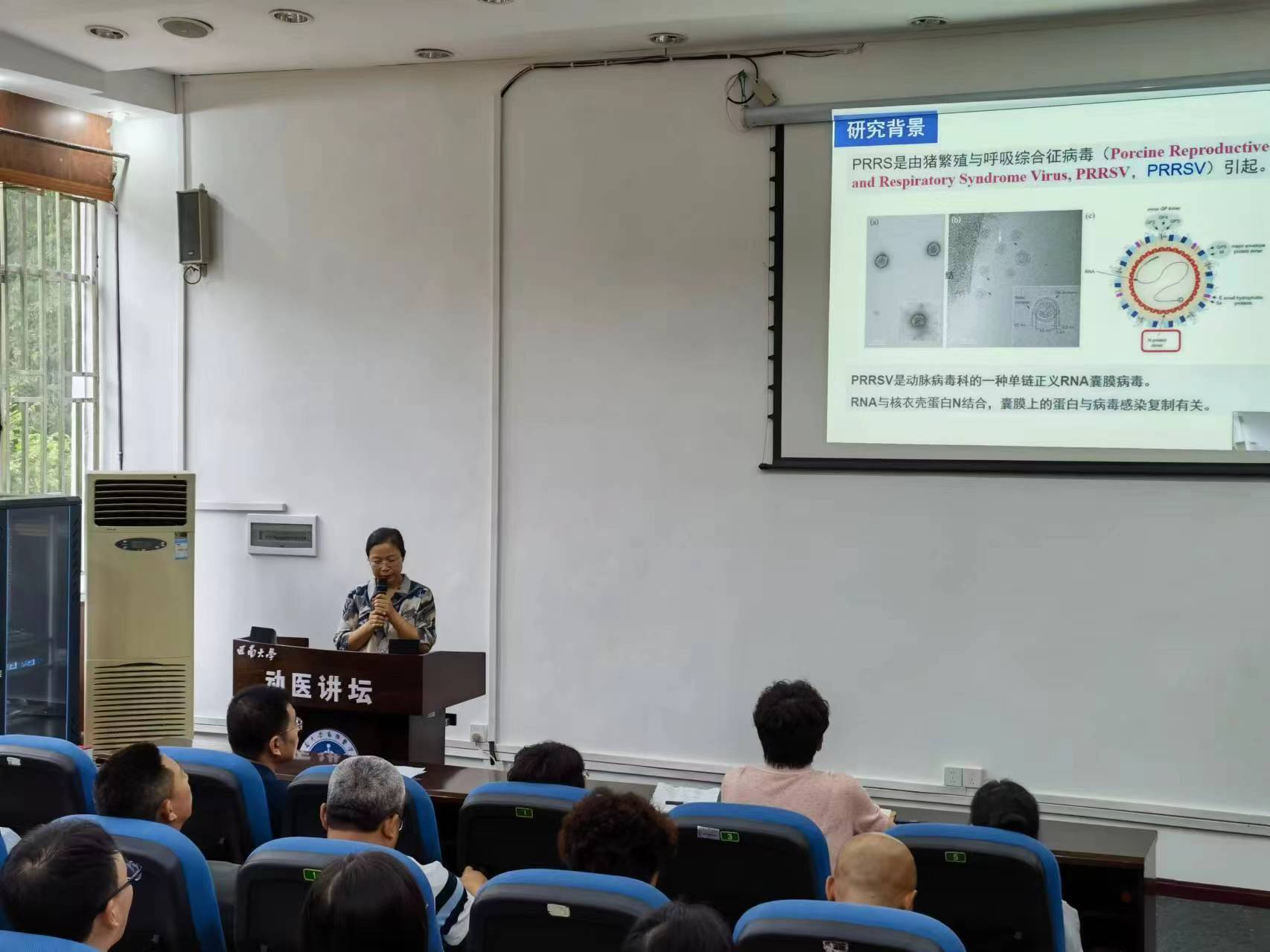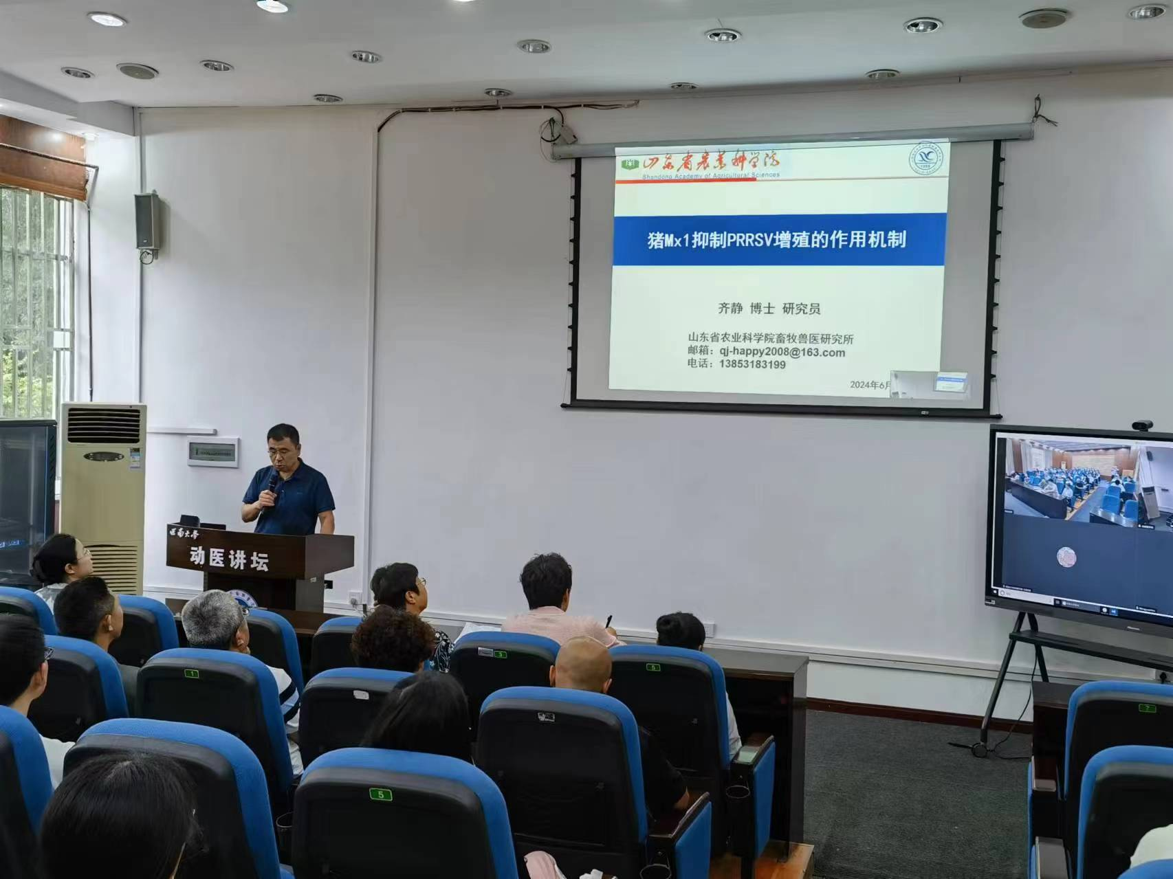 6月27日,山东省农业科AV中文 畜牧兽医研究所齐静研究员在3110报告厅为AV中文 师生做了一场题为“猪Mx1抑制PRRSV增殖的作用机制”的学术报告。报告由宋振辉副院长主持。齐静详细介绍猪先天性免疫蛋白Mx1的GTPase活性,及其通过与Nsp9蛋白竞争和抑制PRRSV-N与Nsp9互作,发挥抑制PRRSV的作用。齐静精彩的报告引起老师和同学们广泛兴趣,报告结束后并与老师和学生们进行互动,细致的回答和讨论了报告中研究问题。齐静的报告提升了师生对猪先天免疫在抗病毒感染作用的理解,拓展了开发抑制PRRSV药物的思路。