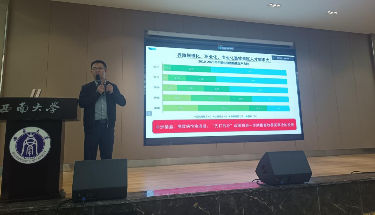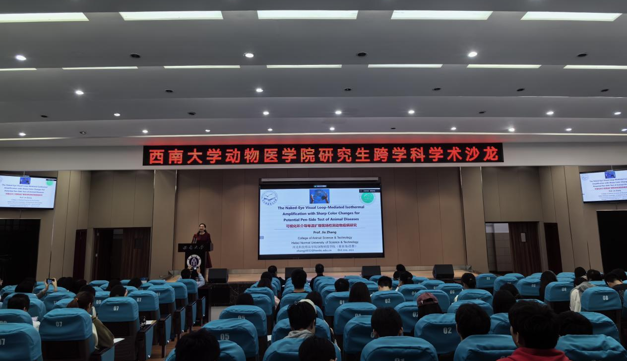 张杰以“The Naked-Eye Visual Loop-Mediated Isothermal Amplification with Sharp Color Changes for Potential Pen-Side Test of Animal Diseases”为题,就我国重要动物传染病、临床快检方法建立、产品合作研发及国际交流合作项目申报进行了深入交流,为在场师生提供了宝贵的学术洞见。AV中文2009级校友欧云文以“青春在服务乡村振兴中闪光”为题,介绍其学习工作经历、科研之路、创新创业大赛、技能大赛与兽医临床技术服务等宝贵经验,极大地激发了同学们的热情,坚定了同学们继续深造兽医专业的决心。